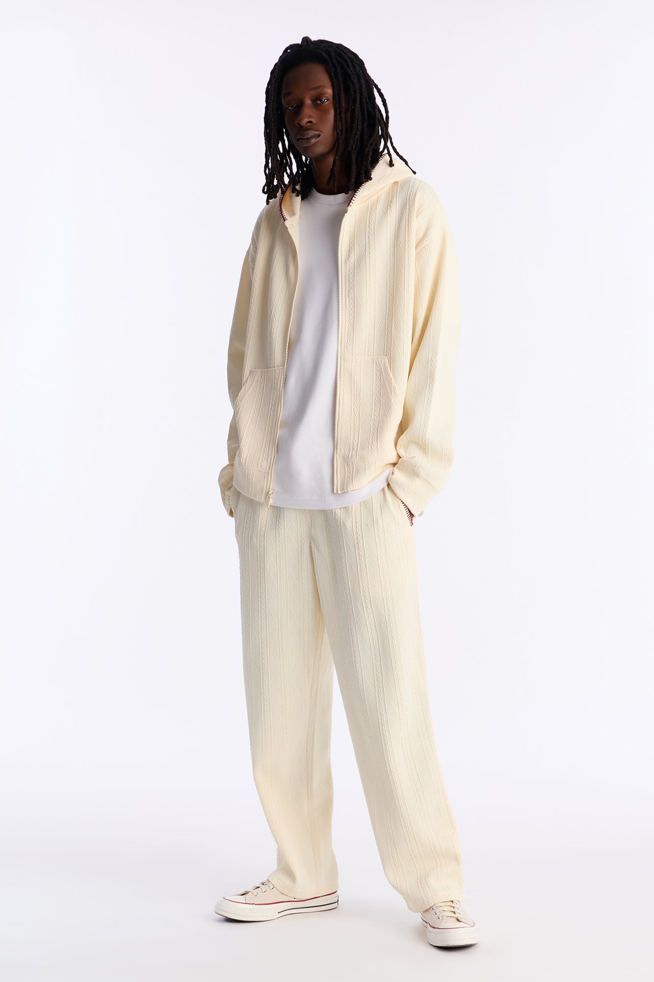 Elevate your casual wardrobe with this cable knit textured stitched hooded jacket in a soft cream color. Crafted from premium knit fabric, it features intricate cable knit patterns and stitched detailing for a textured, artisanal look. The relaxed hooded design offers versatile layering for everyday wear, from chilly fall outings to cozy winter layering. Pull the hood up for added warmth and style, while the roomy fit ensures comfort without bulk. Ideal for streetwear enthusiasts, weekend errands, or pairing with jeans and boots. Durable construction maintains shape and softness wash after wash. Available in cream for a neutral, timeless appeal that complements any outfit.