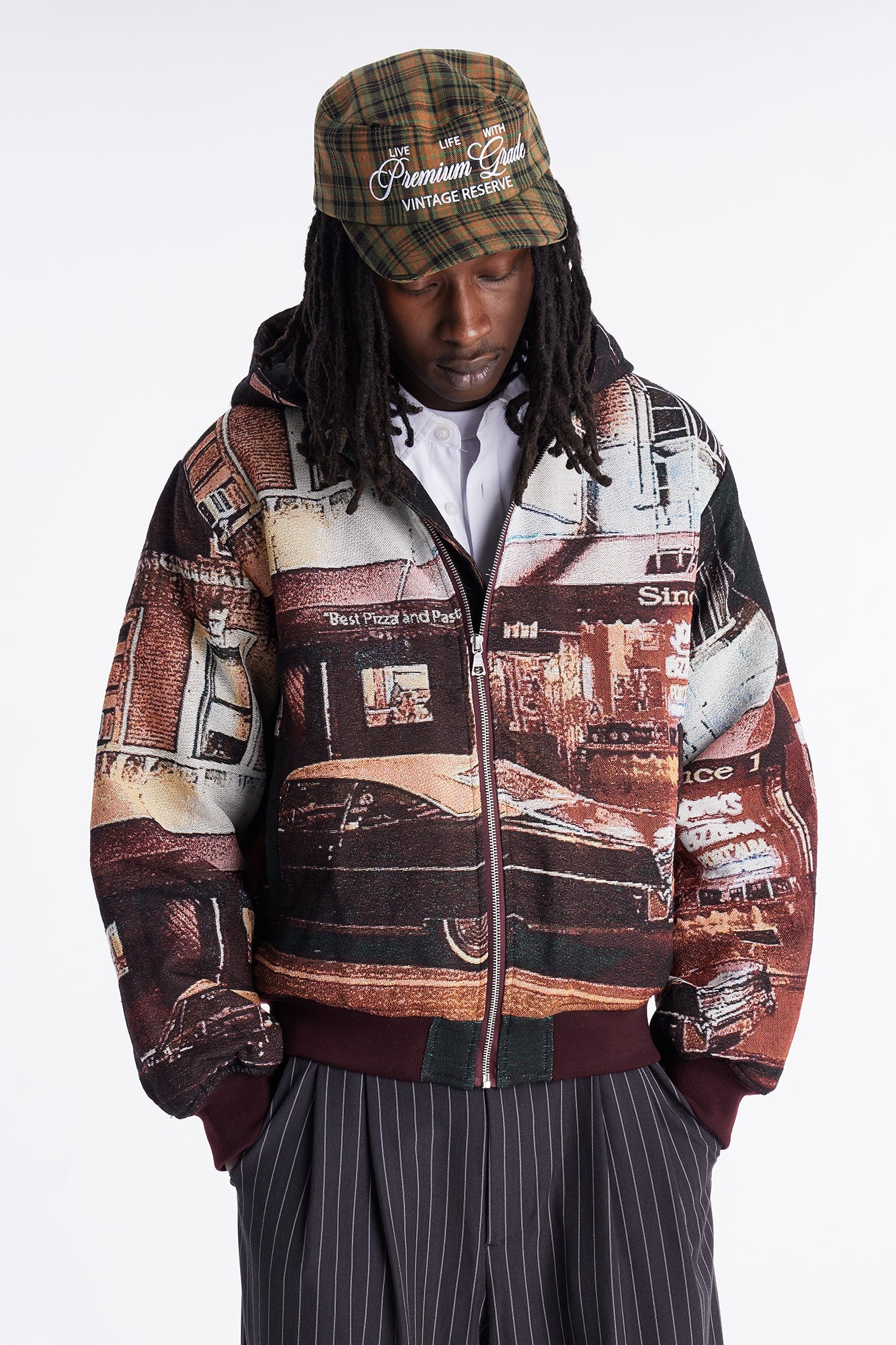 Elevate your streetwear style with the Oversized Through The Night Tapestry Hooded Bomber Jacket in rich burgundy. This standout piece features an intricate tapestry print inspired by nocturnal cityscapes, blending urban artistry with premium comfort. Crafted from soft, durable polyester fabric with a brushed fleece lining, it offers exceptional warmth for cooler evenings without sacrificing breathability.